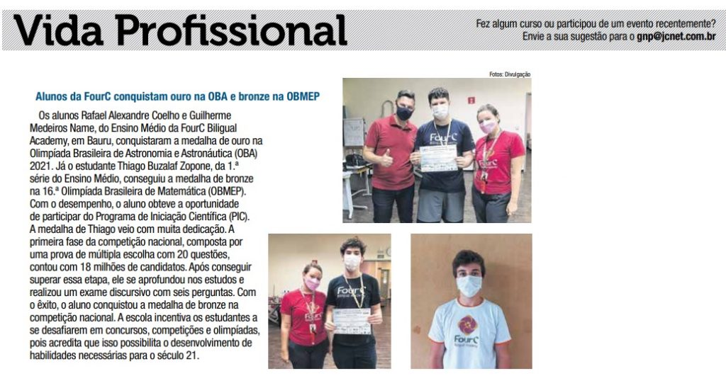 Nossos alunos Rafael Alexandre Coelho e Guilherme Medeiros Name, do Ensino Médio, conquistaram a medalha de ouro na Olimpíada Brasileira de Astronomia e Astronáutica (OBA) 2021. Já o estudante Thiago Buzalaf Zopone, da 1.ª série do Ensino Médio, conseguiu a medalha de bronze na 16.ª Olimpíada Brasileira de Matemática (OBMEP). Os alunos ganharam destaque no Jornal da Cidade de Bauru.