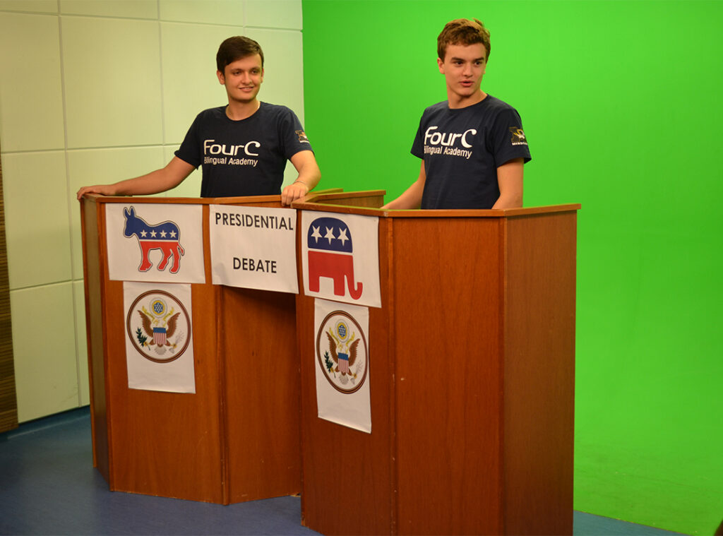 Através de uma comunicação full-time, os alunos conseguem desenvolver habilidades de organização do pensamento para falar, argumentar, debater, fundamentar e defender suas ideias, em inglês, diante de um público.