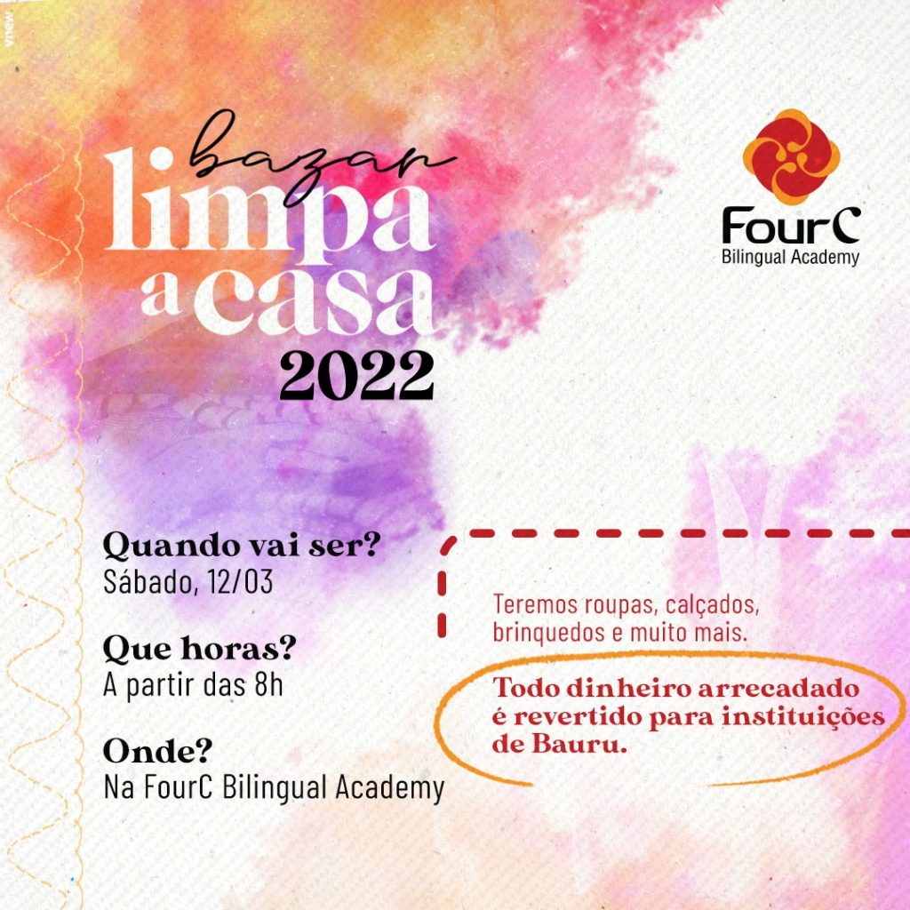 No dia 12 de março (sábado), das 8h às 12h, a escola FourC Bilingual Academy realiza o Bazar Limpa a Casa 2022. Aberto à comunidade, o Bazar é realizado por meio de doações de pais, alunos, comunidade e colaboradores FourC. São milhares de itens entre roupas, sapatos, utilidades domésticas, brinquedos, bijuterias, móveis, eletroeletrônicos, livros entre outros itens. Toda a renda arrecadada é revertida para a compra de materiais às entidades de Bauru e região assistidas pela Associação 4C Comunidade. Durante o evento, a escola irá seguir os protocolos de biossegurança e a entrada das pessoas será controlada, garantindo o bem-estar de todos.