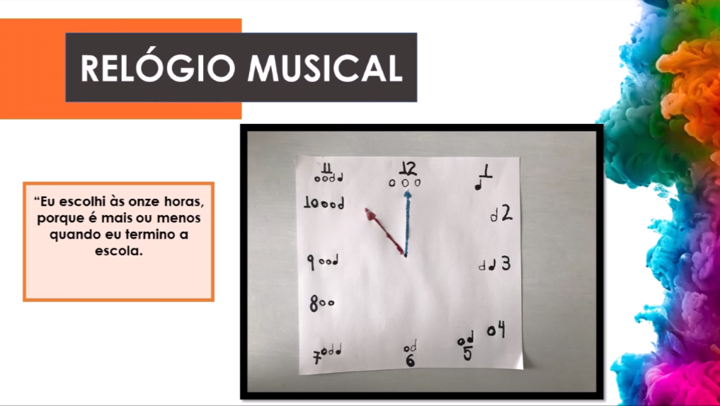 Qual é o seu horário favorito do dia? Com o objetivo de desenvolver a linguagem rítmica e medir o tempo musical, os alunos realizaram o projeto Relógio Musical. A atividade uniu música e matemática, estimulando a criação e inovação do seu próprio relógio. Confira o vídeo com as produções dos alunos:
